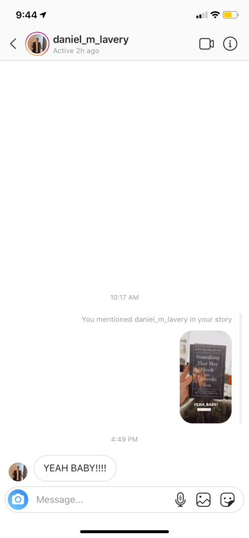 Breaking news: Daniel M. Lavery‘s essay collection, Something That May Shock and Discredit You, is officially out! I pre-ordered because I’m a full stan. I made an Instagram story about it when I received it and DANNY FUCKING DM’D ME. I have photographic evidence!
