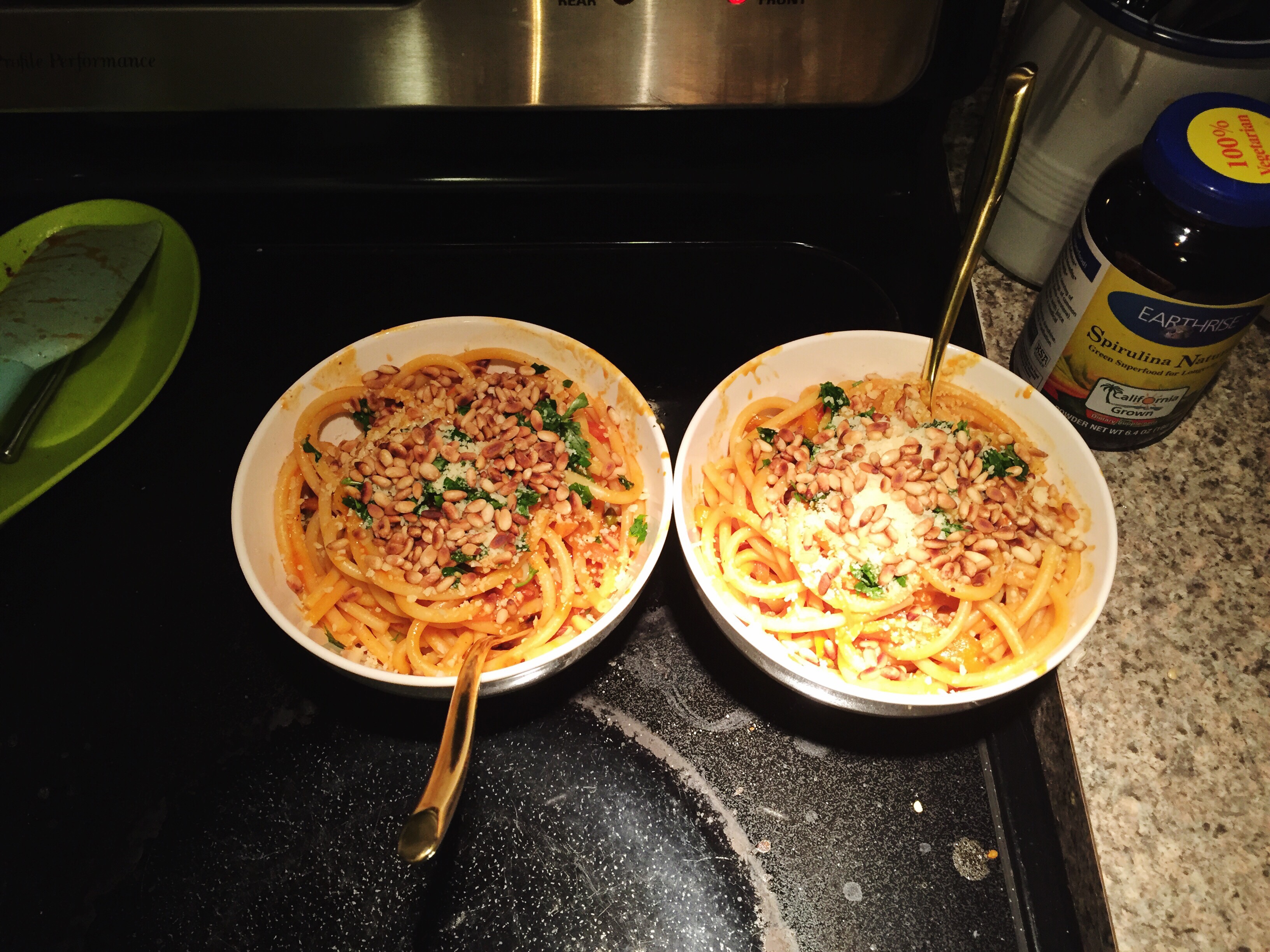 Apart from these beautiful innovations, however, I felt a little stifled by the recipe. Me being me, I…improved upon this already solid recipe by adding sliced white onion into the base of the sauce, and replacing about 1/2 cup of the liquid with white wine. I also neglected to wipe out the pan after toasting the pine nuts, as any residue (I assumed) would add a lovely flavor profile to the foundation of the sauce. I was also able to cut the prep time in half with what I call “building”: instead of slicing the vegetables/ingredients ahead of time, I add ingredients to the pan one at a time prepping as I go, starting with onions and then moving to firmer vegetables and herbs. I am not what you call a “mise-en-place” chef.