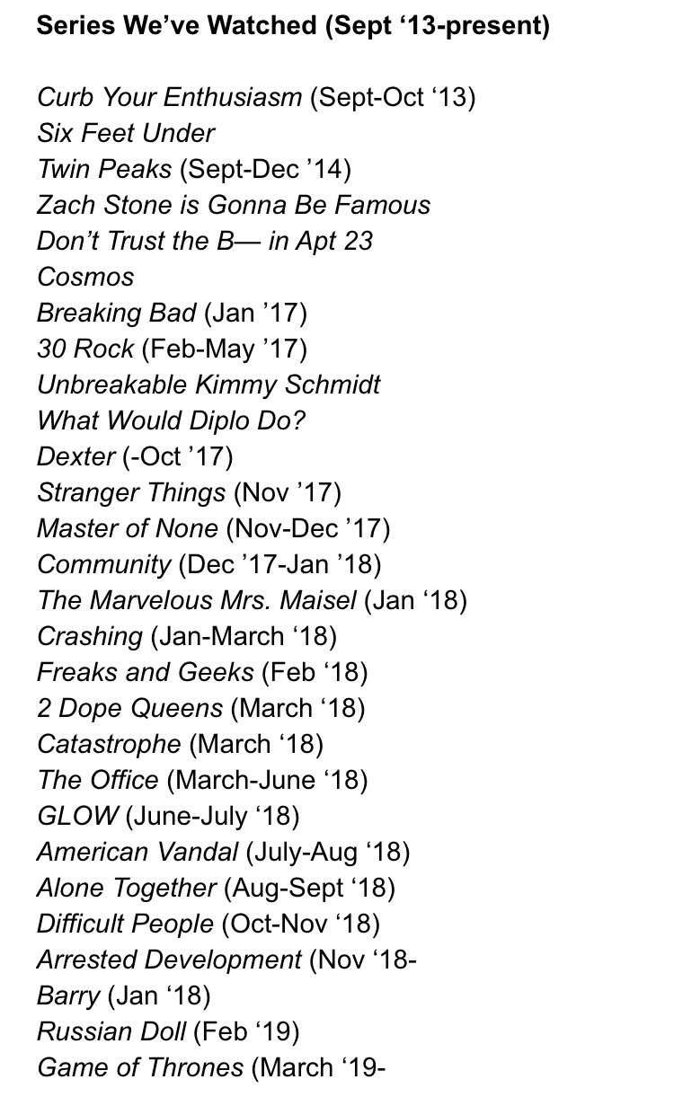 Fast forward several years—for me, a move, two degrees, a marriage, a few garbage jobs and one good one—I’m in a very different place in my life. For years, my husband and I have kept a running list of TV shows we’ve watched together, are watching, and plan to watch. Game of Thrones has been sitting atop it, since its inception. We’ve made it through countless series, but, due to my predilections and my title of Foremost Comedy Scholar in the Greater Boston Area, alarmingly few have been dramas. Six Feet Under, Dexter (because Michael C. Hall is *bites lip and closes eyes*), Breaking Bad, Stranger Things, Twin Peaks (we are…white). That’s in nearly 6 years, at a rate of at least an episode every day. Every time we finished a series, my husband would timidly ask, “Game of Thrones next?” And one day in March 2019, I finally said, “You know what? Sure.”
