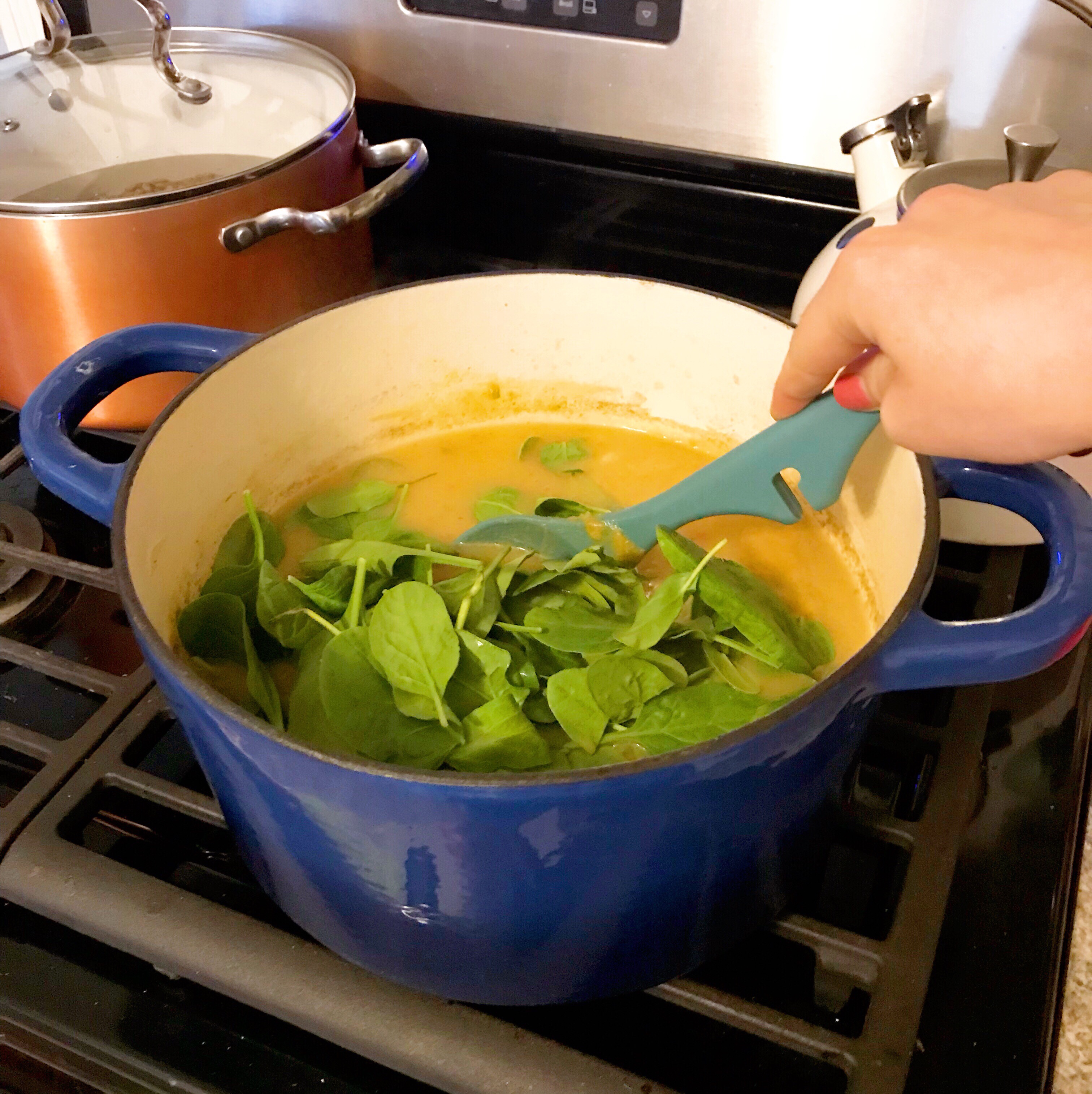 This is not your average potato leek soup. Not that I’m hating on anyone else’s recipe, but *very Guy Fieri voice* I take it to Flavortown. I like it a little spicy and a little colorful. Sweet potato and red bell pepper jazz up what would otherwise (honestly) be beige sludge, and white beans add some protein for all my vegetarians out there! Lastly, folding in some spinach at the very end adds some extra vitamins and minerals!