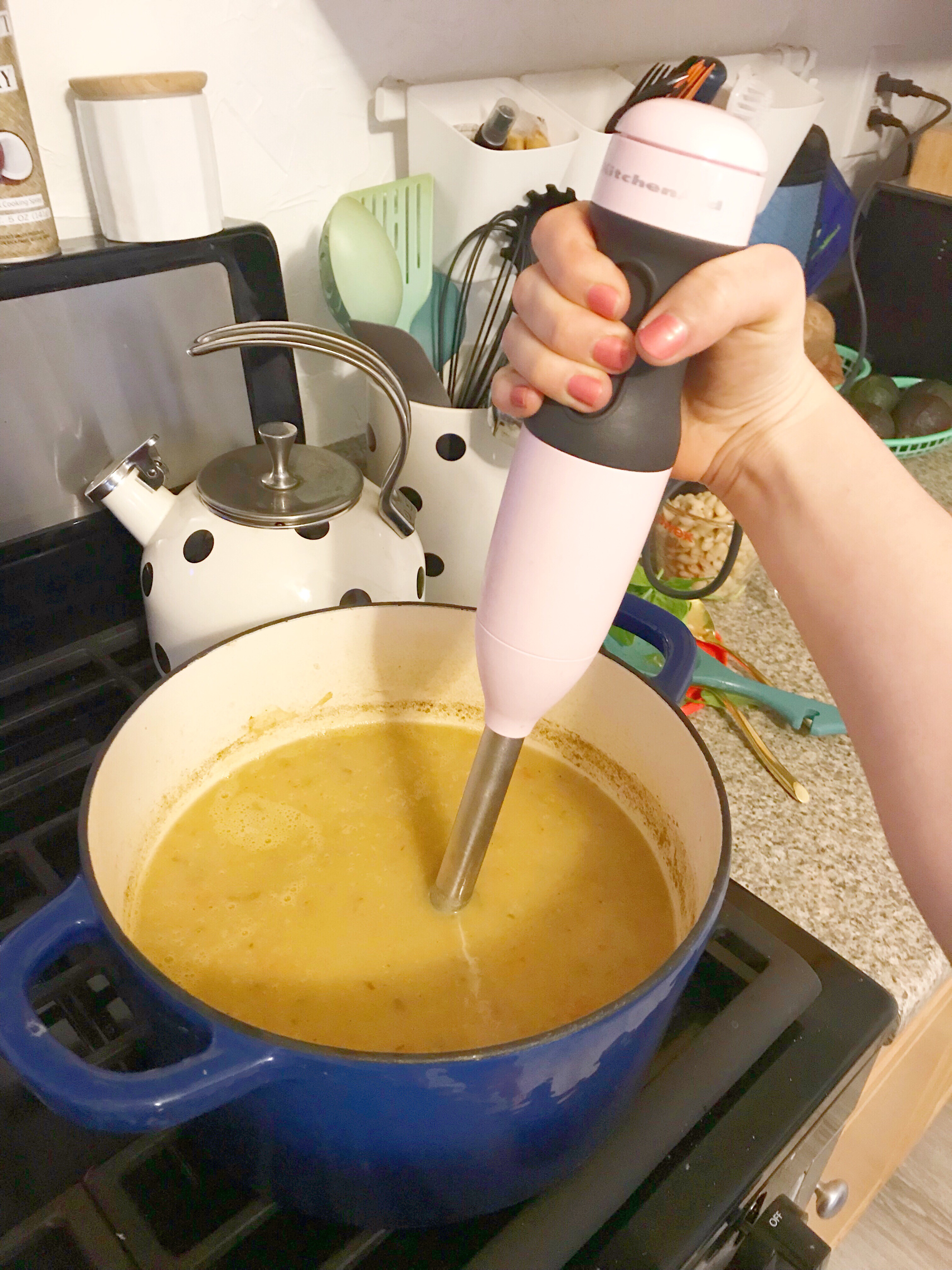 Turn off the heat and remove the bay leaves before blending! You can do this in batches in a blender or food processor, but I am telling you, get an immersion blender. Best money you’ll ever spend. I promise. Once the soup is blended to your ideal consistency (chunky or smooth are both good, it’s up to you!), add your white beans and cook for a few more minutes. Turn the heat off and fold in the spinach. Let rest until the spinach is wilted. Stir, taste, and adjust salt & pepper to taste.